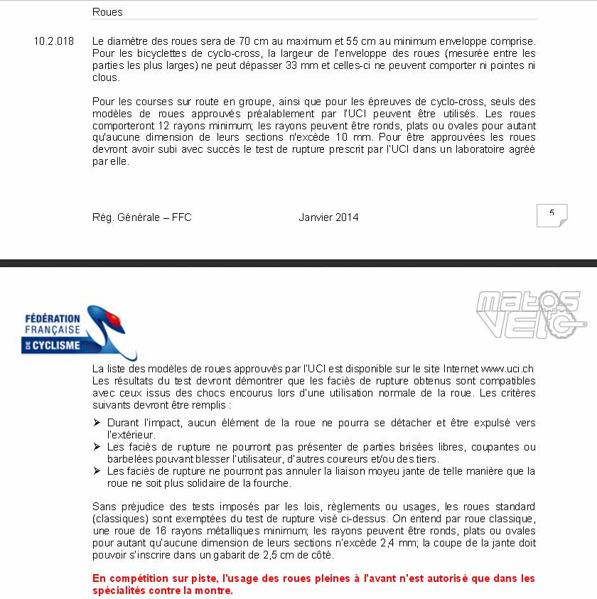 Si l'on étudie le règlement FFC concernant le matériel et les équipements vestimentaires, la chose est claire, la FFC aligne son règlement sur celui de l'UCI pour les roues.