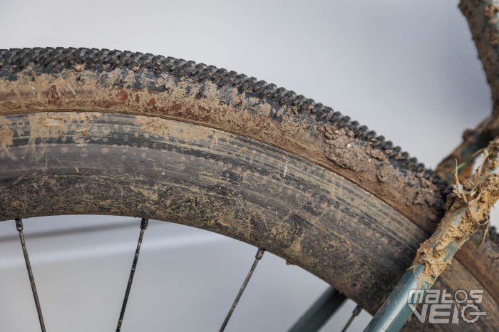 Mais sur des portions de route, j'ai été étonné de ne pas ressentir d'effet "frein" particulier malgré les très basses pressions utilisées. On peut rouler à 30/32 km/h plutôt facilement malgré la fatigue et à cette vitesse, je n'ai vraiment pas eu l'impression d'être collé, le vélo arrive à conserver la vitesse facilement. Seules les mises en vitesse sont forcément plus difficiles avec des pneus très lourds, mais il y a moins d'effet de pompage quand on se met en danseuse qu'avec des jantes plus étroites.