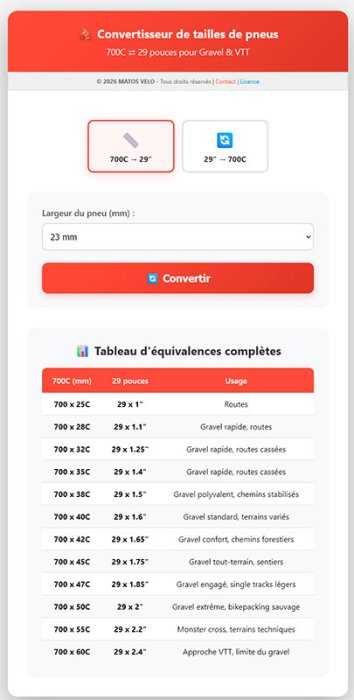 Convertisseur de tailles pneus 700C ⇄ 29 pouces