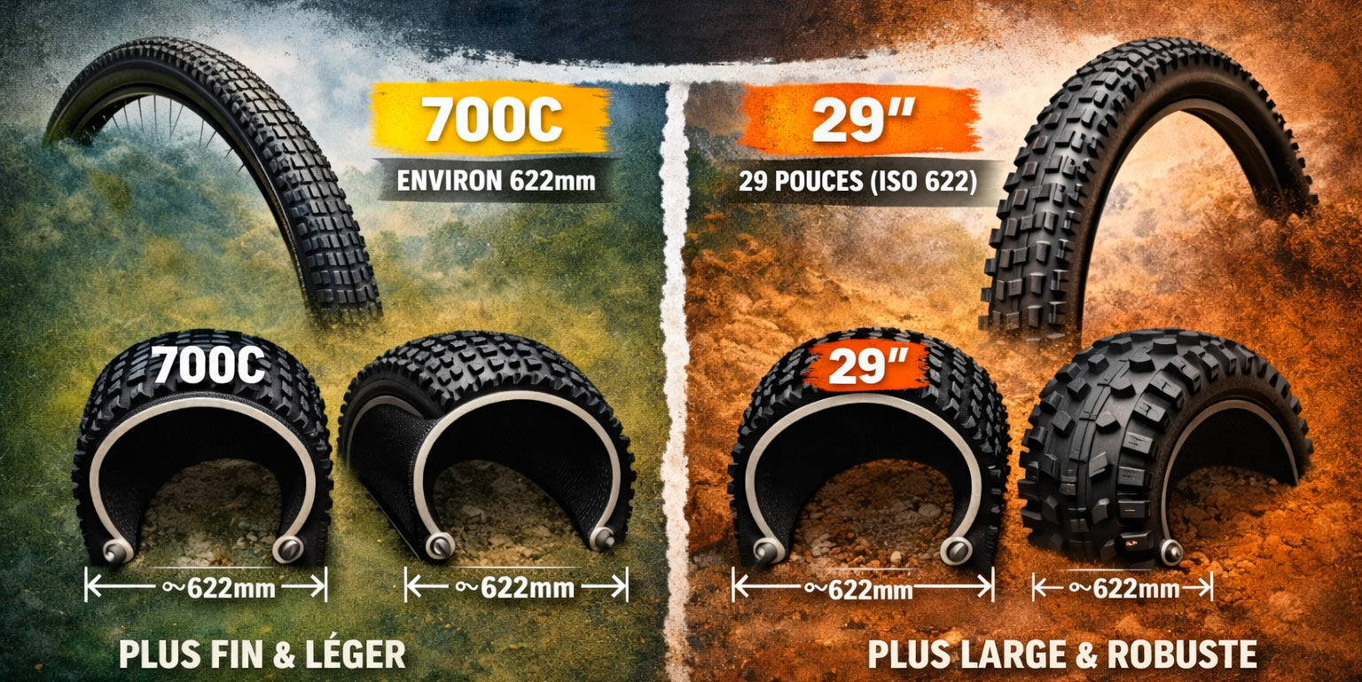 Au fil des évolutions techniques et de la standardisation internationale, ces deux appellations ont fini par désigner exactement la même chose : une jante de 622 millimètres de diamètre selon la norme ETRTO, le système de mesure européen qui fait aujourd'hui référence. Ainsi, un pneu gravel marqué 700x40C et un pneu VTT étiqueté 29x1.6" pourront se monter sur la même jante sans aucun problème.