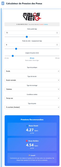 J'ai de mon côté créé ce calculateur de pression des pneus route et gravel, en version plus simple, mais qui vous permettra de partir sur une base que vous pourrez ensuite adapter.