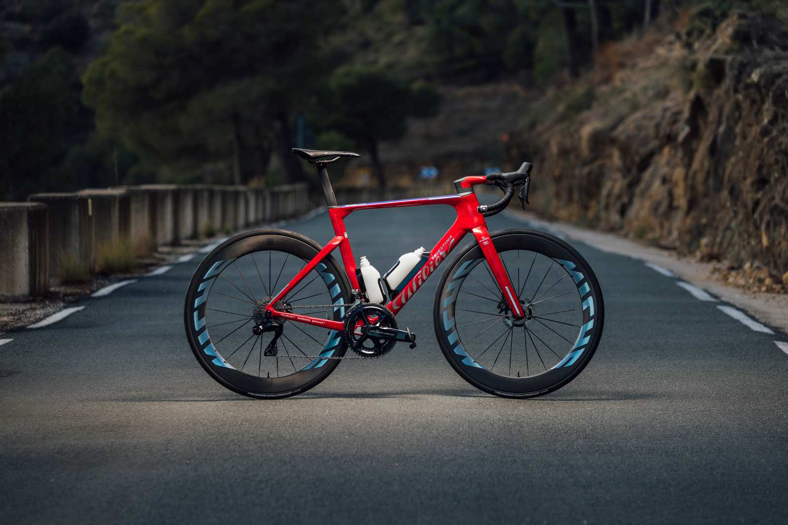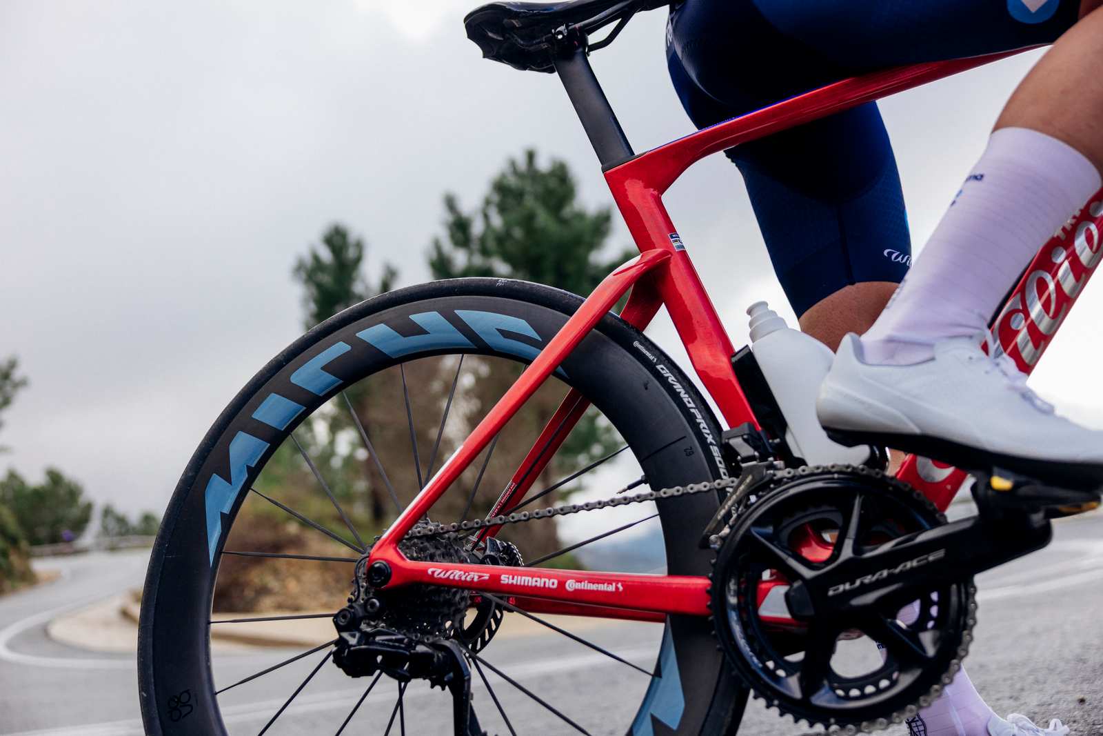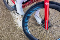 La configuration 14+7 rayons (avant et arrière), soit seulement 21 rayons au total contre 24 habituellement, offre un équilibre optimal entre poids, réactivité et précision de direction. Cette réduction a été rendue possible grâce à la rigidité exceptionnelle des rayons carbone par rapport à leur poids, permettant une masse en rotation réduite et une meilleure stabilité sous charge latérale.
