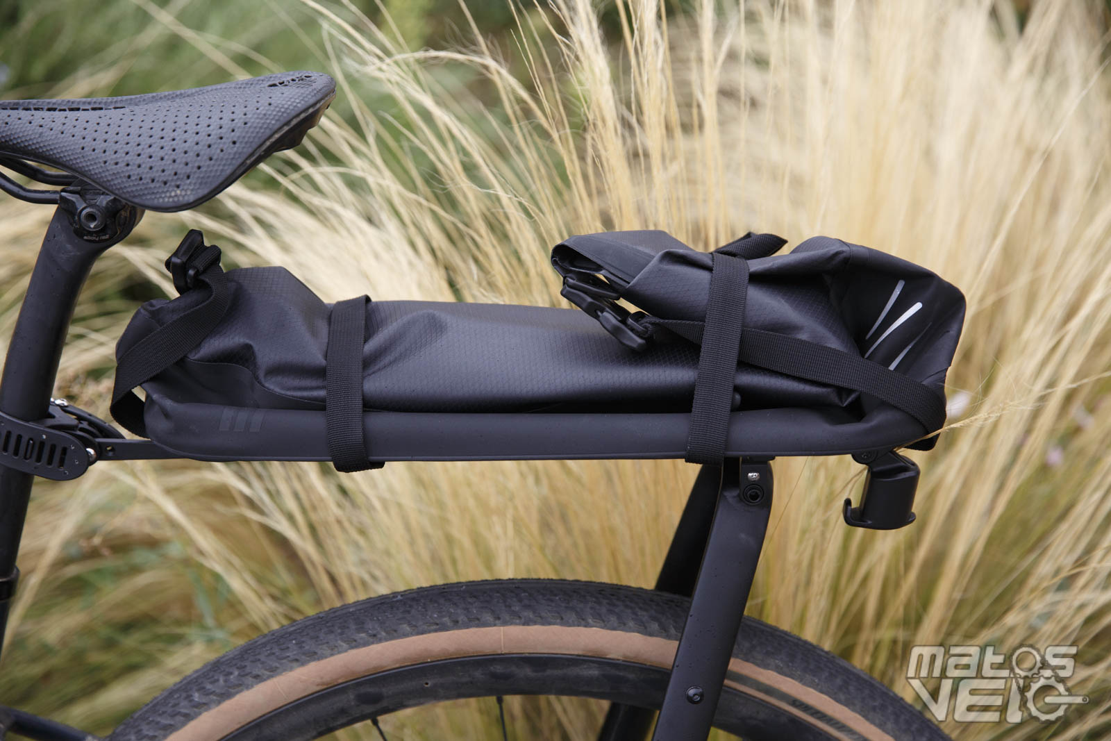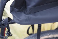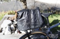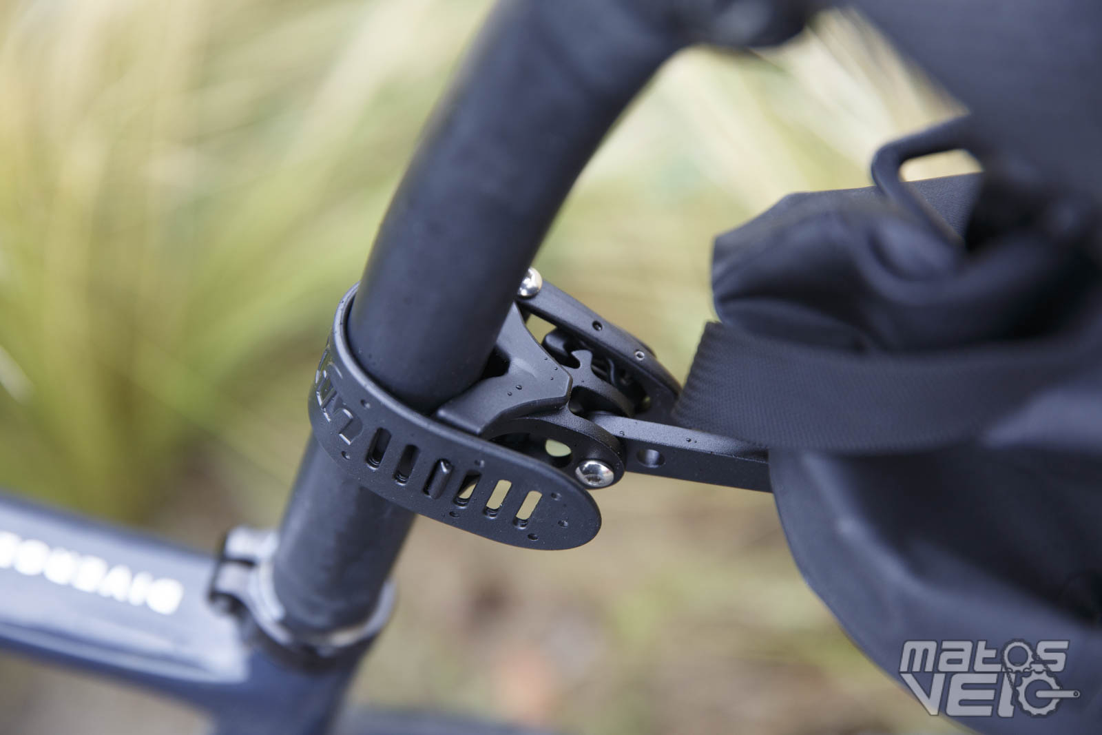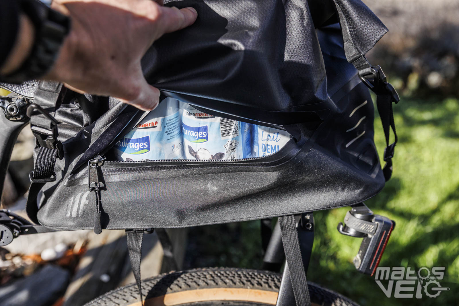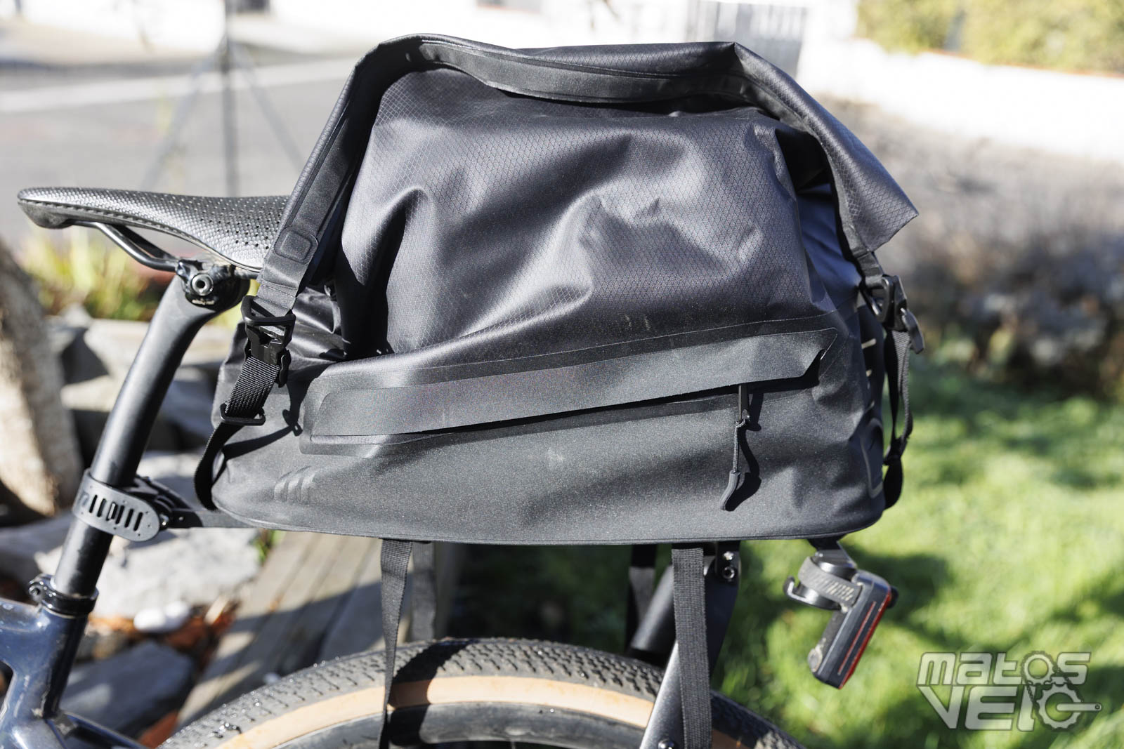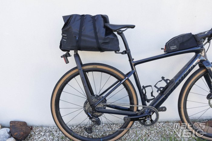 J'ai pu tester ce porte-bagages avec une sacoche Super Light de 20 litres (165 €) qui se fixe via un connecteur qui se glisse sous le hauban supérieur, et deux goupilles en acier inoxydable traversant des fixations en alliage d'aluminium usiné CNC. Une fois le sac roulé et ses sangles bouclées, l'installation et le retrait s'effectuent en quelques secondes. Le sac propose une poche latérale zippée donnant accès au compartiment principal sans déboucler les sangles, ainsi qu'une poche séparée pour les outils de réparation ou barres énergétiques.