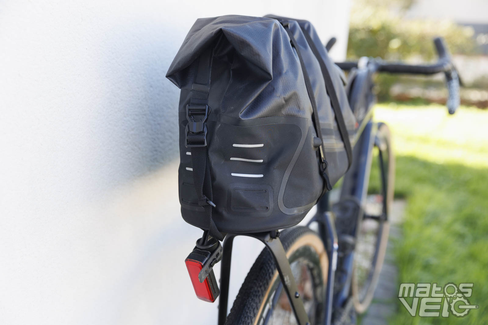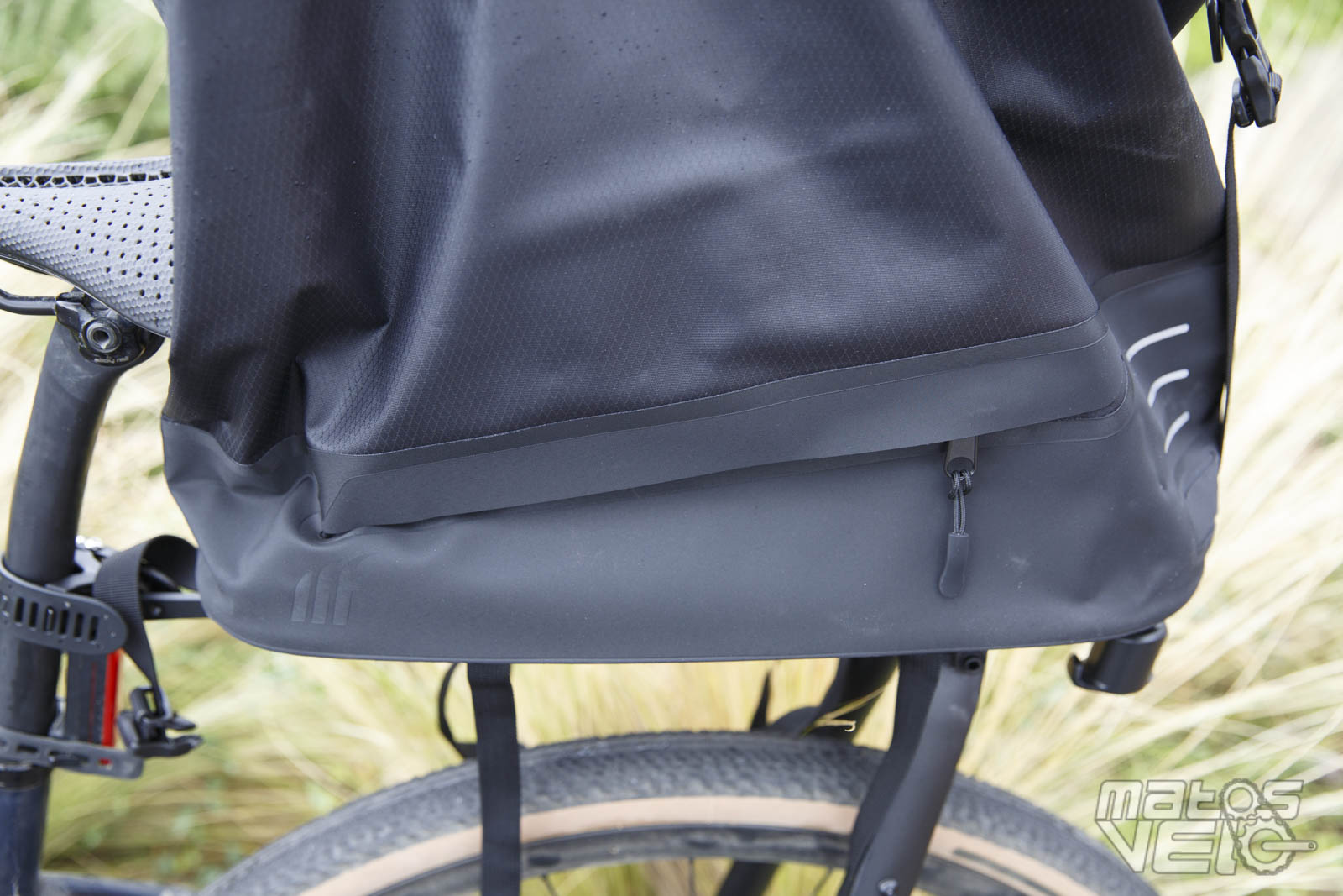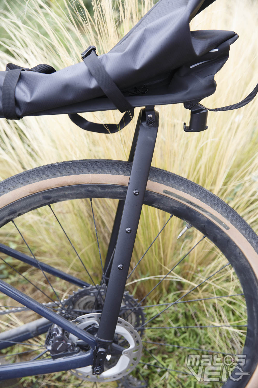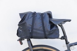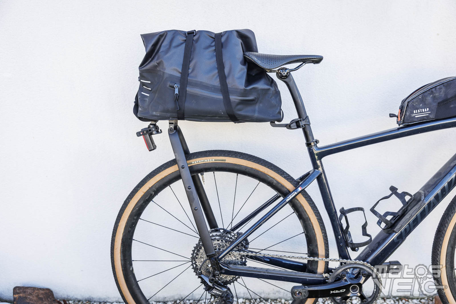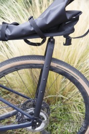 J'ai pu tester ce porte-bagages avec une sacoche Super Light de 20 litres (165 €) qui se fixe via un connecteur qui se glisse sous le hauban supérieur, et deux goupilles en acier inoxydable traversant des fixations en alliage d'aluminium usiné CNC. Une fois le sac roulé et ses sangles bouclées, l'installation et le retrait s'effectuent en quelques secondes. Le sac propose une poche latérale zippée donnant accès au compartiment principal sans déboucler les sangles, ainsi qu'une poche séparée pour les outils de réparation ou barres énergétiques.