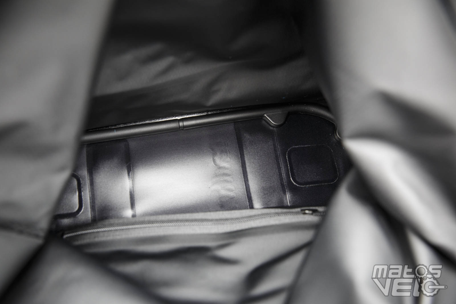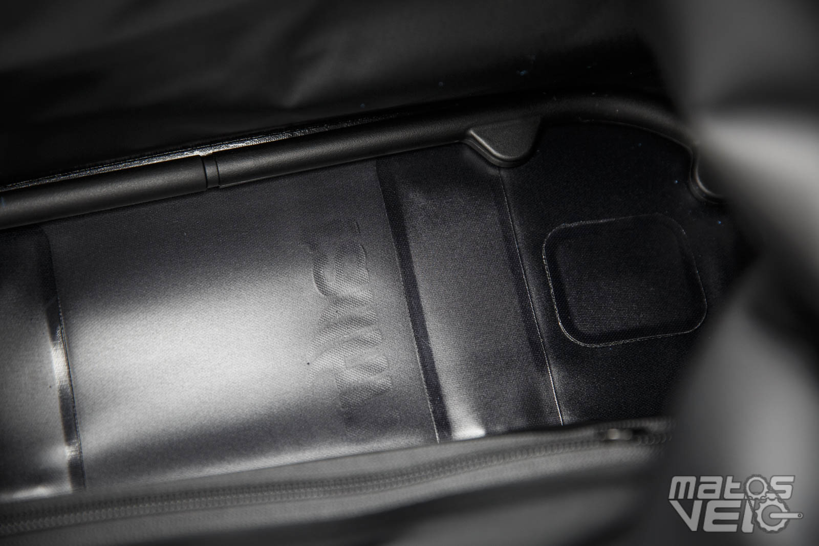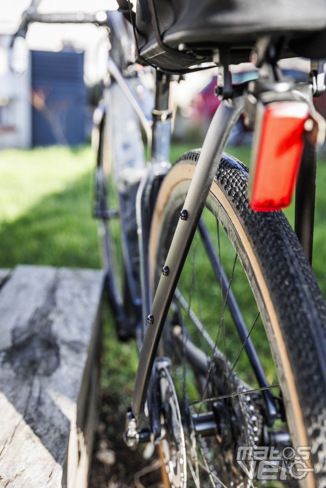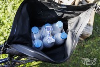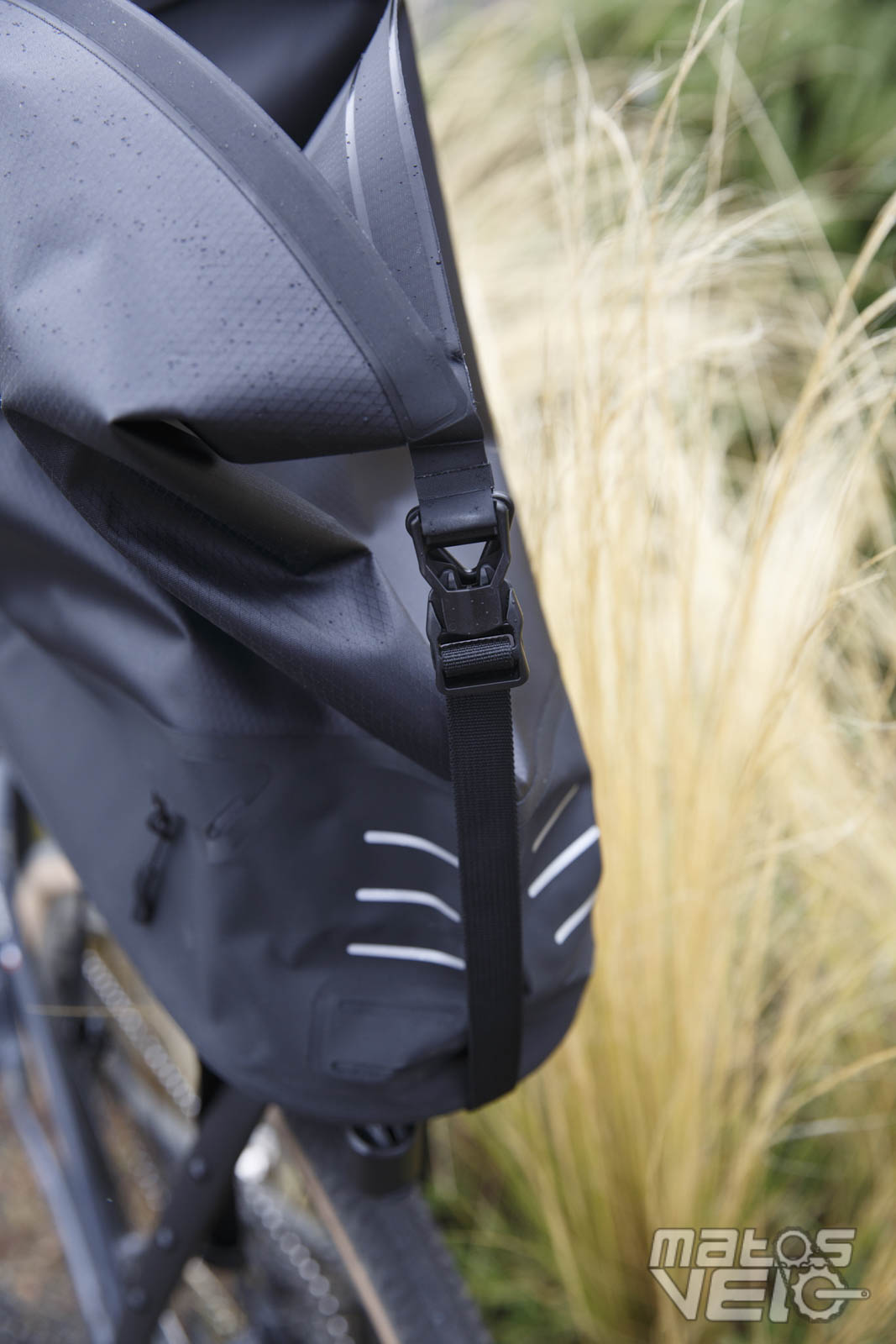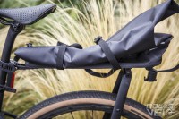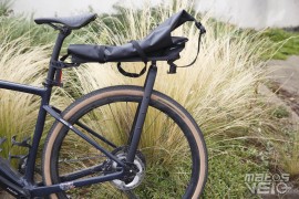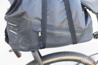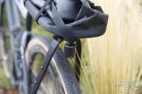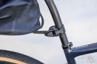 J'ai pu tester ce porte-bagages avec une sacoche Super Light de 20 litres (165 €) qui se fixe via un connecteur qui se glisse sous le hauban supérieur, et deux goupilles en acier inoxydable traversant des fixations en alliage d'aluminium usiné CNC. Une fois le sac roulé et ses sangles bouclées, l'installation et le retrait s'effectuent en quelques secondes. Le sac propose une poche latérale zippée donnant accès au compartiment principal sans déboucler les sangles, ainsi qu'une poche séparée pour les outils de réparation ou barres énergétiques.