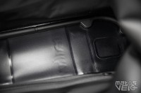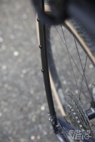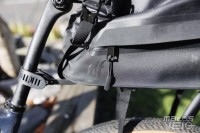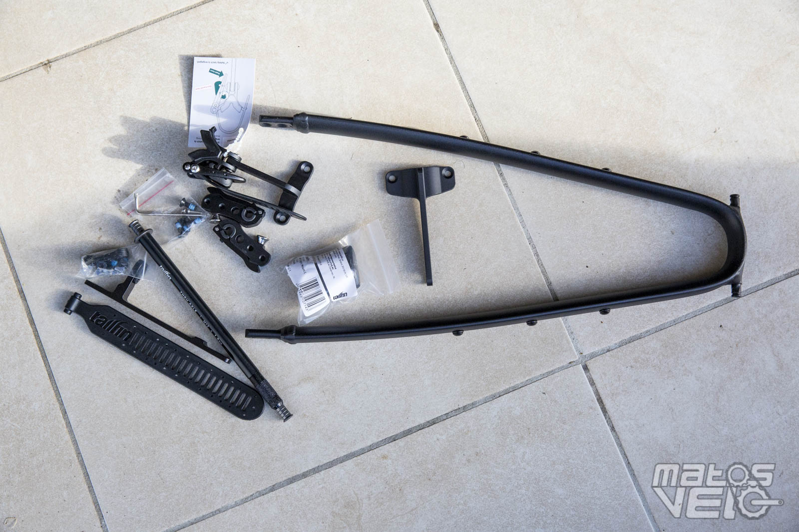 À l'avant du porte-bagages, une sangle élastique entoure la tige ou le tube de selle et se fixe sur un crochet avec un levier de verrouillage. Tailfin recommande de protéger la zone de contact avec du ruban adhésif pour éviter toute rayure de la peinture lorsque des particules s'insinuent entre la sangle et le cadre.
