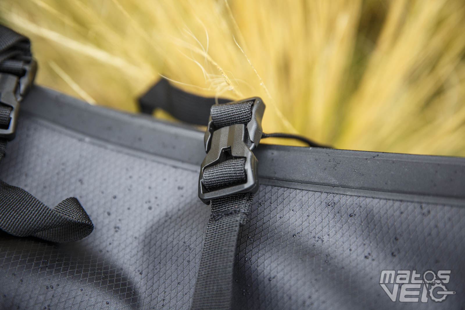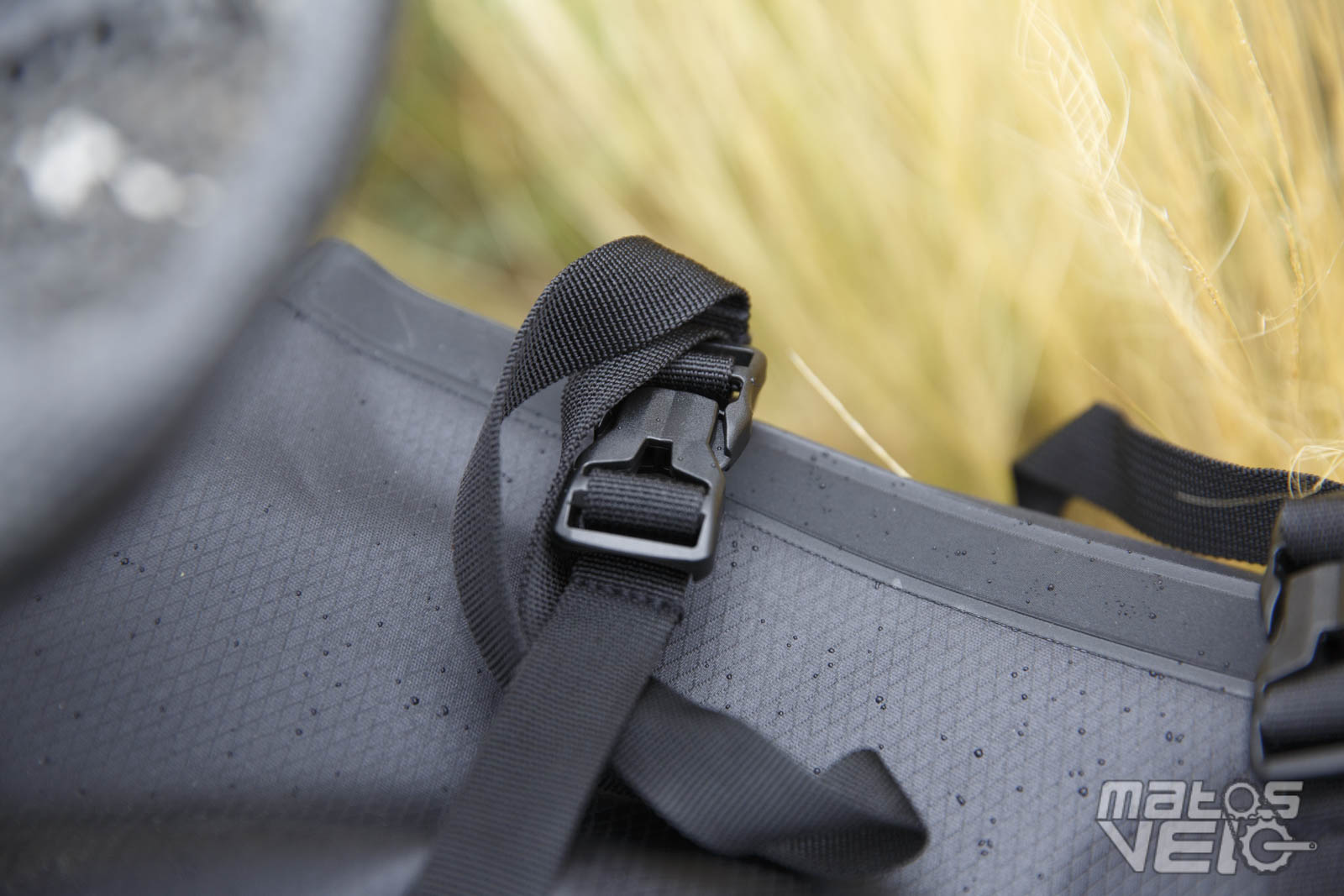 Parmi les accessoires notables figurent un support d'éclairage fixé sous l'arrière du sac de dessus (20 €) et un support cargo avec trois œillets pour transporter une grande gourde ou un bidon horizontalement sous le sac de dessus (20 €).