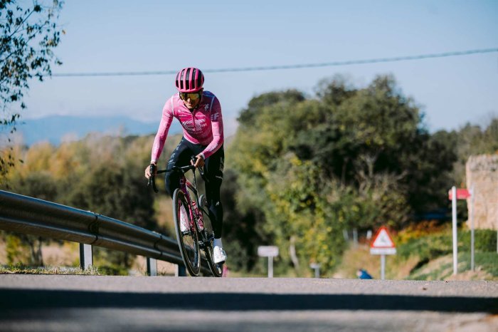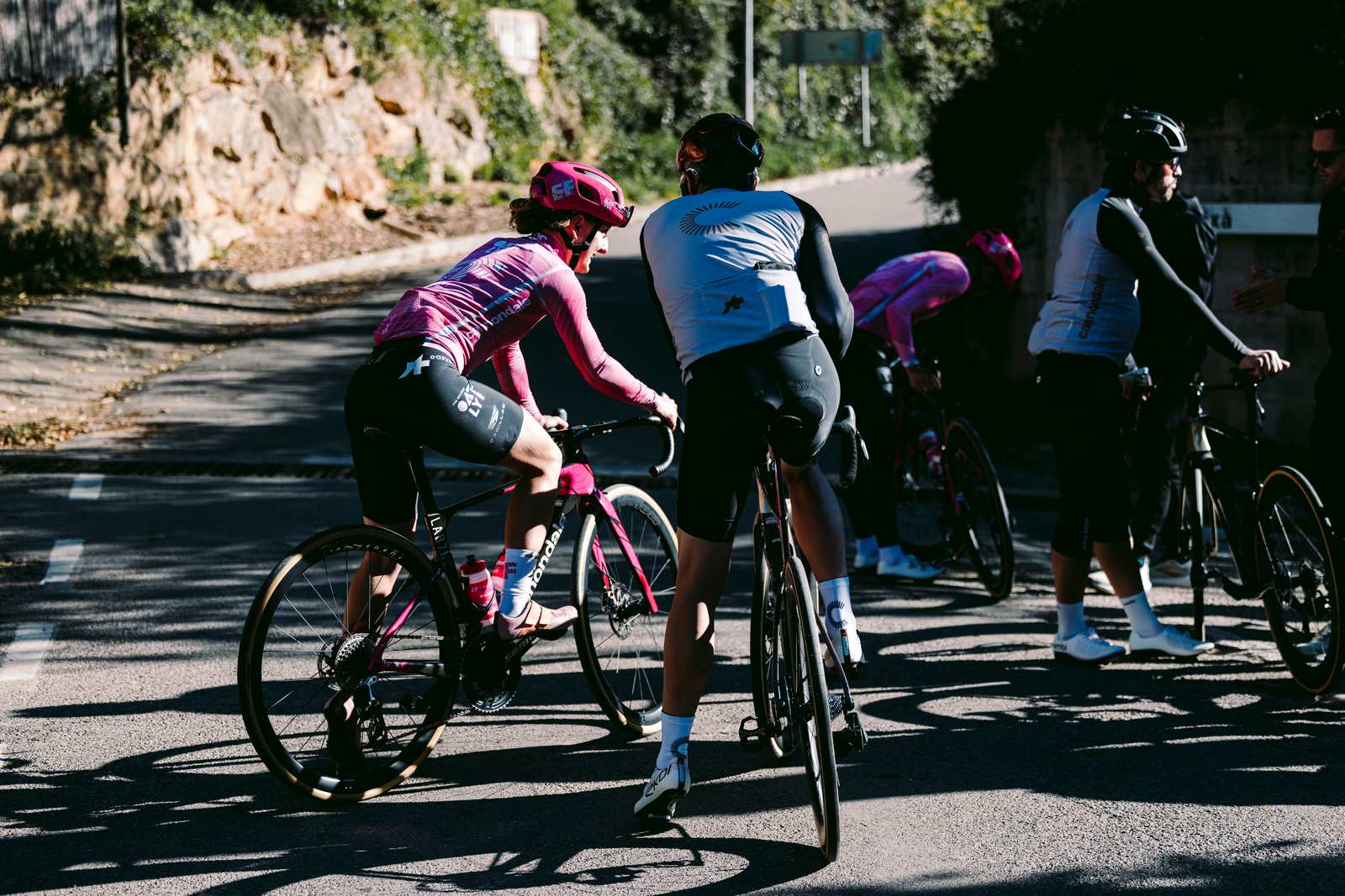 Sur les routes autour de Gérone, j’ai pu effectuer un premier galop d’essai en compagnie notamment de Cédrine Kerbaol, Richard Carapaz et Ben Healy, qui tous trois découvraient aussi ce vélo.