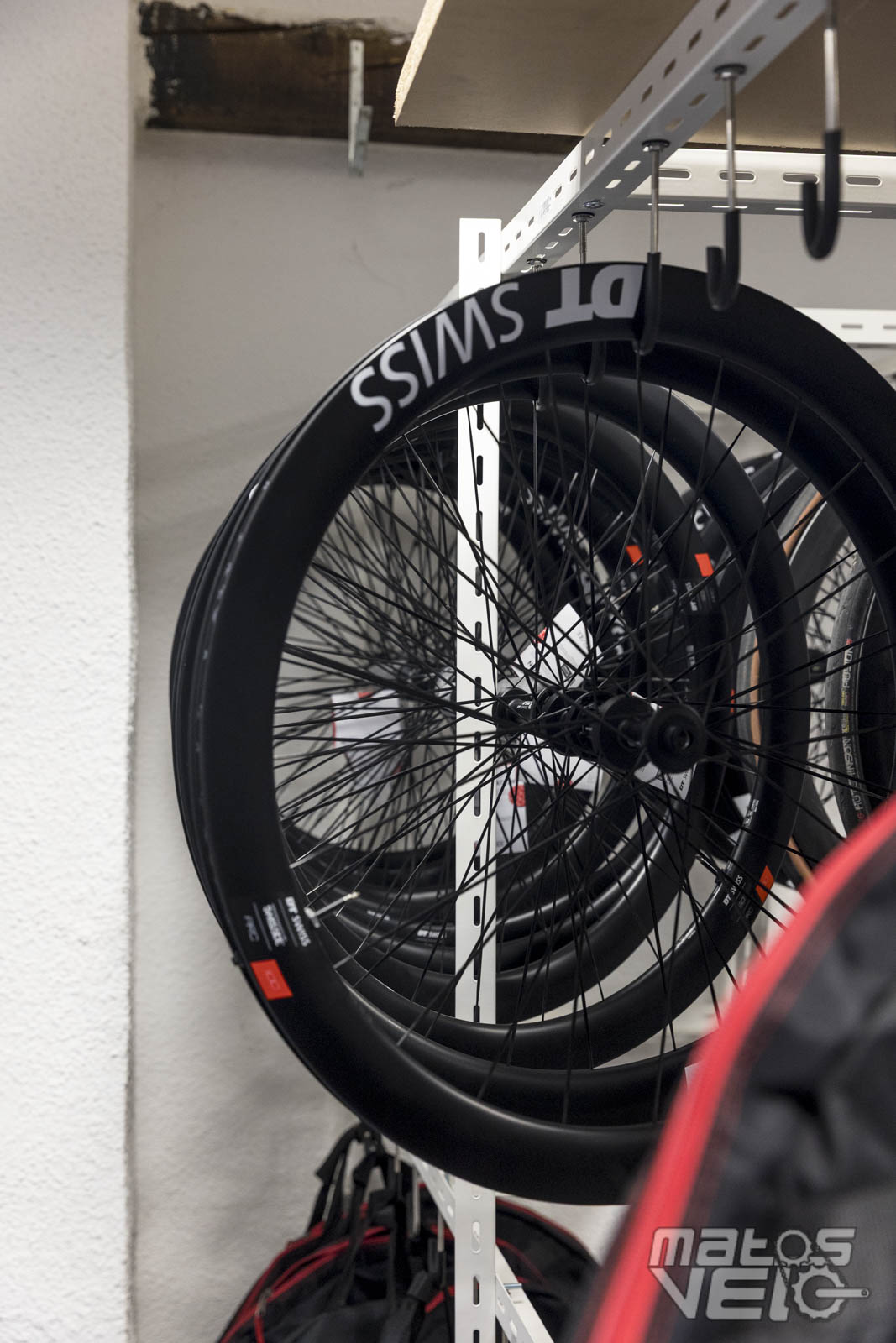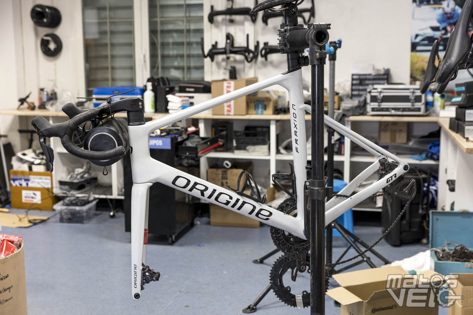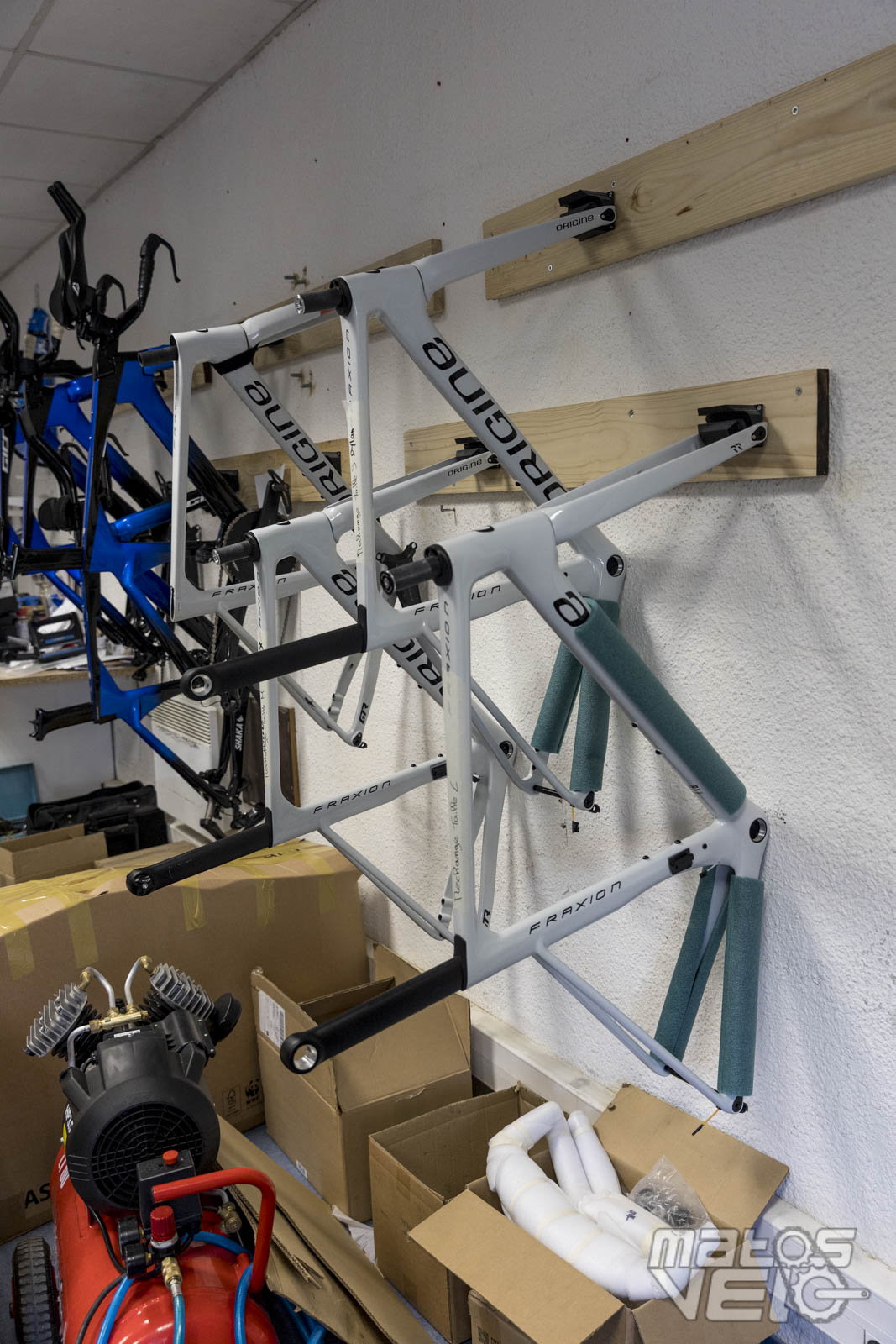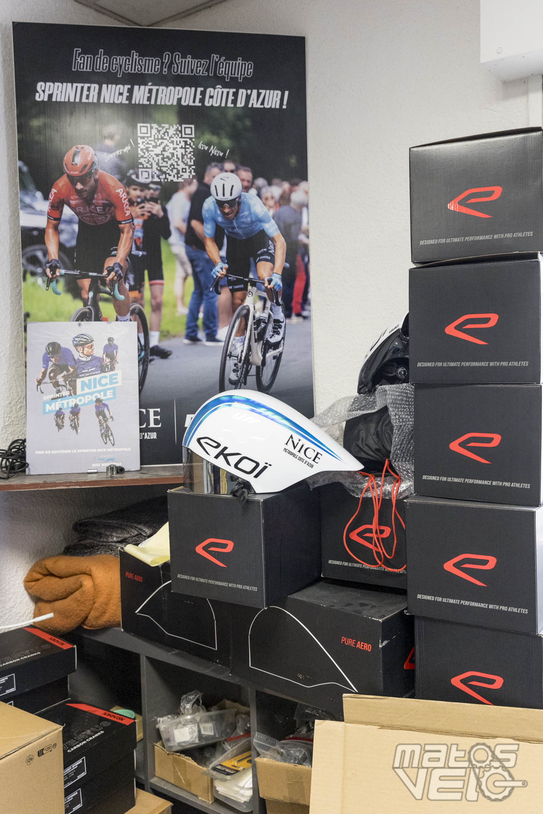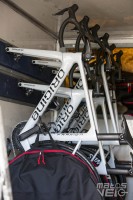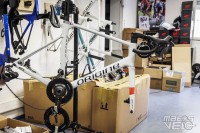 Côté atelier, on est loin des bâtiments World Tour. Ici, seuls deux mécaniciens dans un petit espace pour stocker les vélos, roues, casques, la diététique, .....
