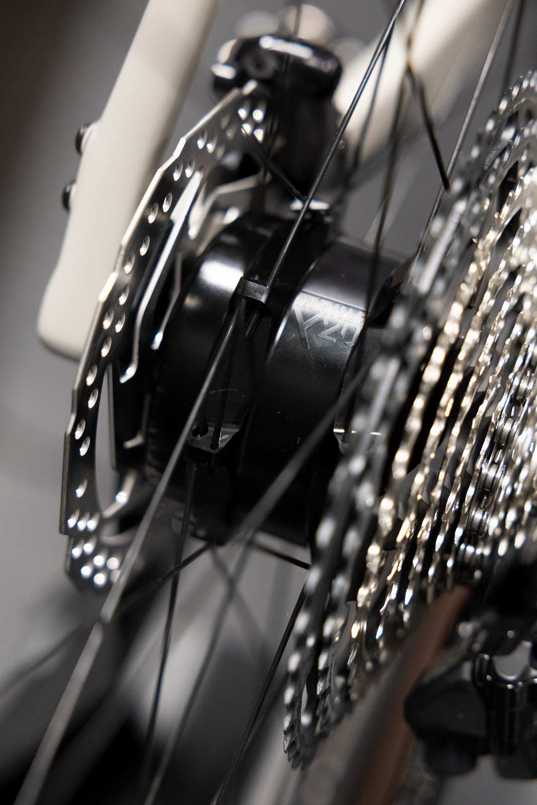 Côté performances, le X20 délivre 65 Nm de couple et 275 watts en crête, ce qui représente une assistance franchement utile dans les cols, face au vent ou sur les sections gravel. Au-delà de 25 km/h, le moteur se désengage sans résistance perceptible, permettant d'atteindre les vitesses d'un vélo de route classique.