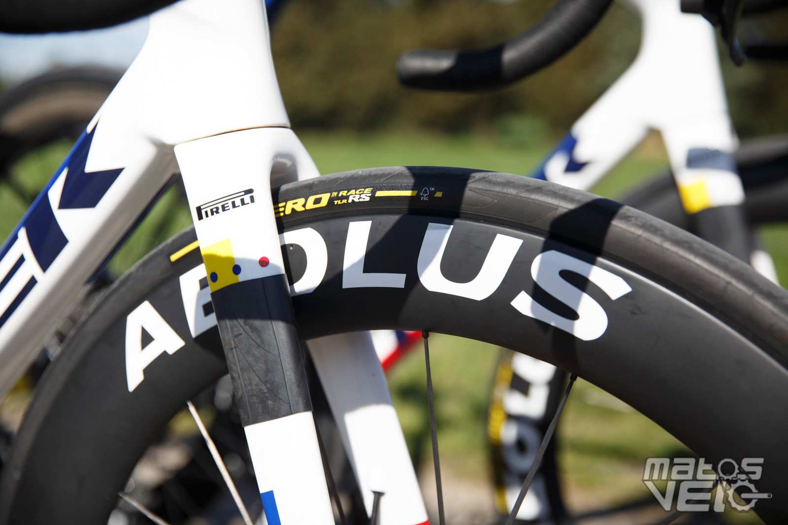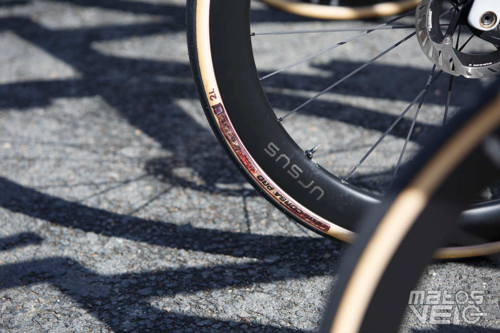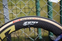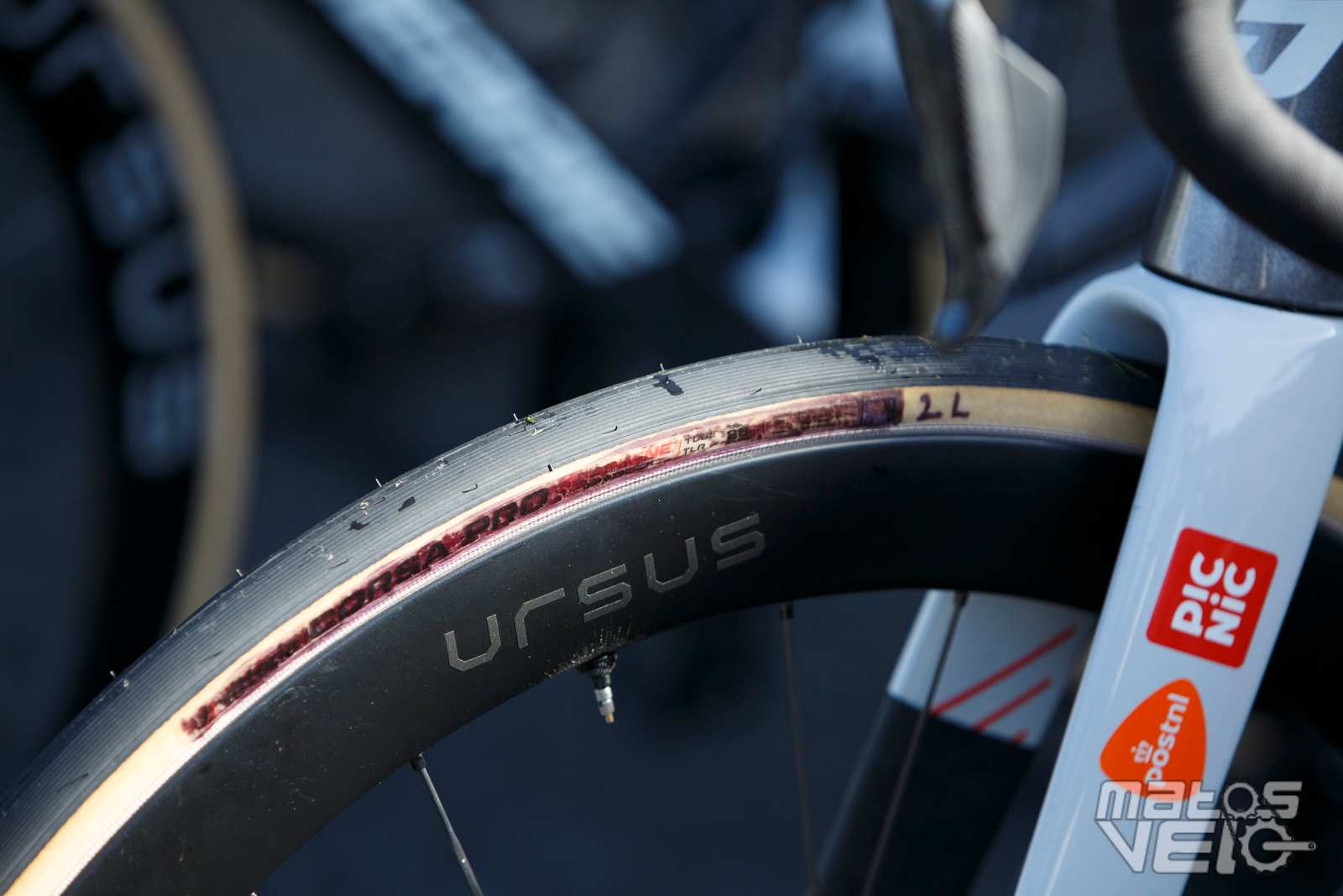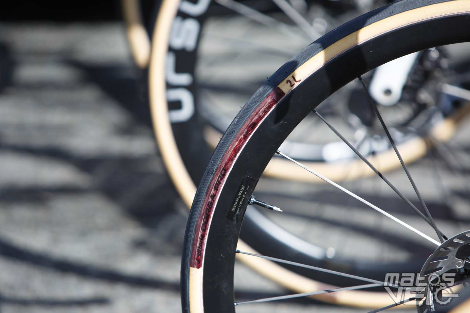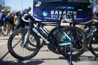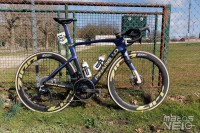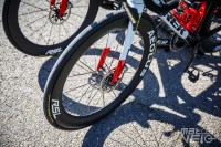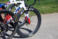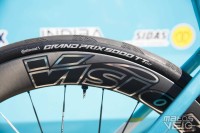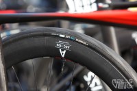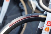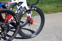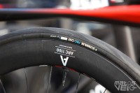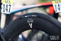 Alors que Michelin a annoncé en début d'année son partenariat avec l'équipe, les coureurs roulent tous avec des pneus Vittoria Corsa Pro... avec leur marquage très mal camouflé.