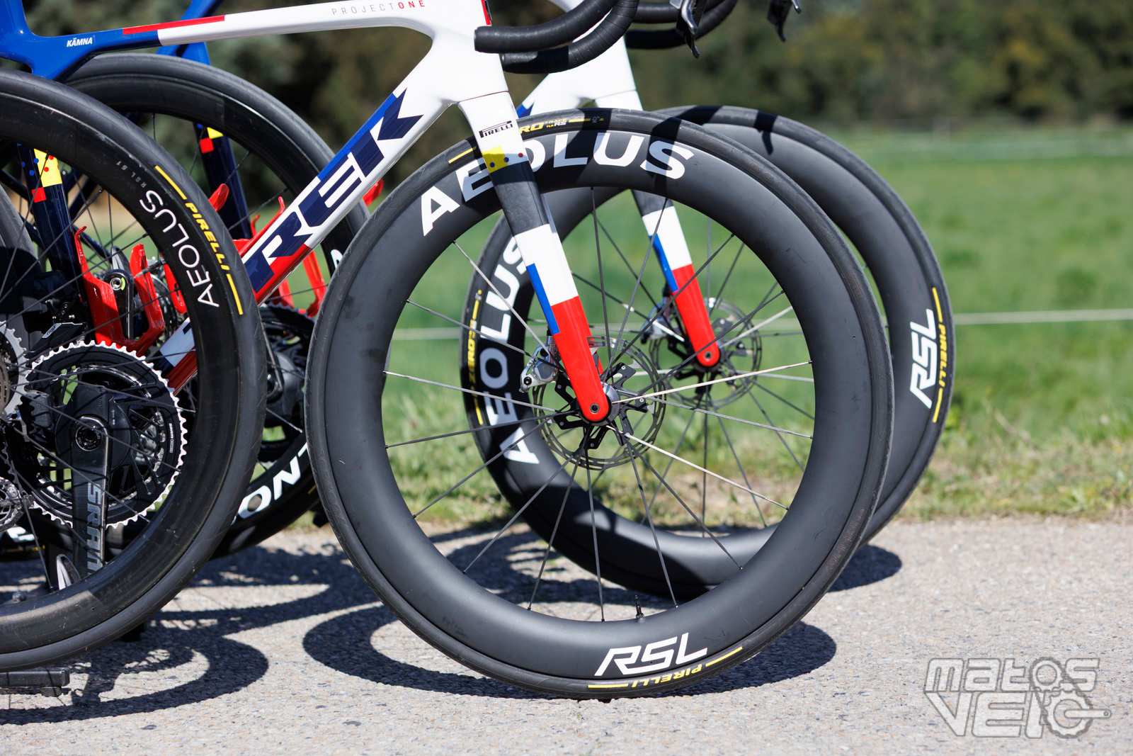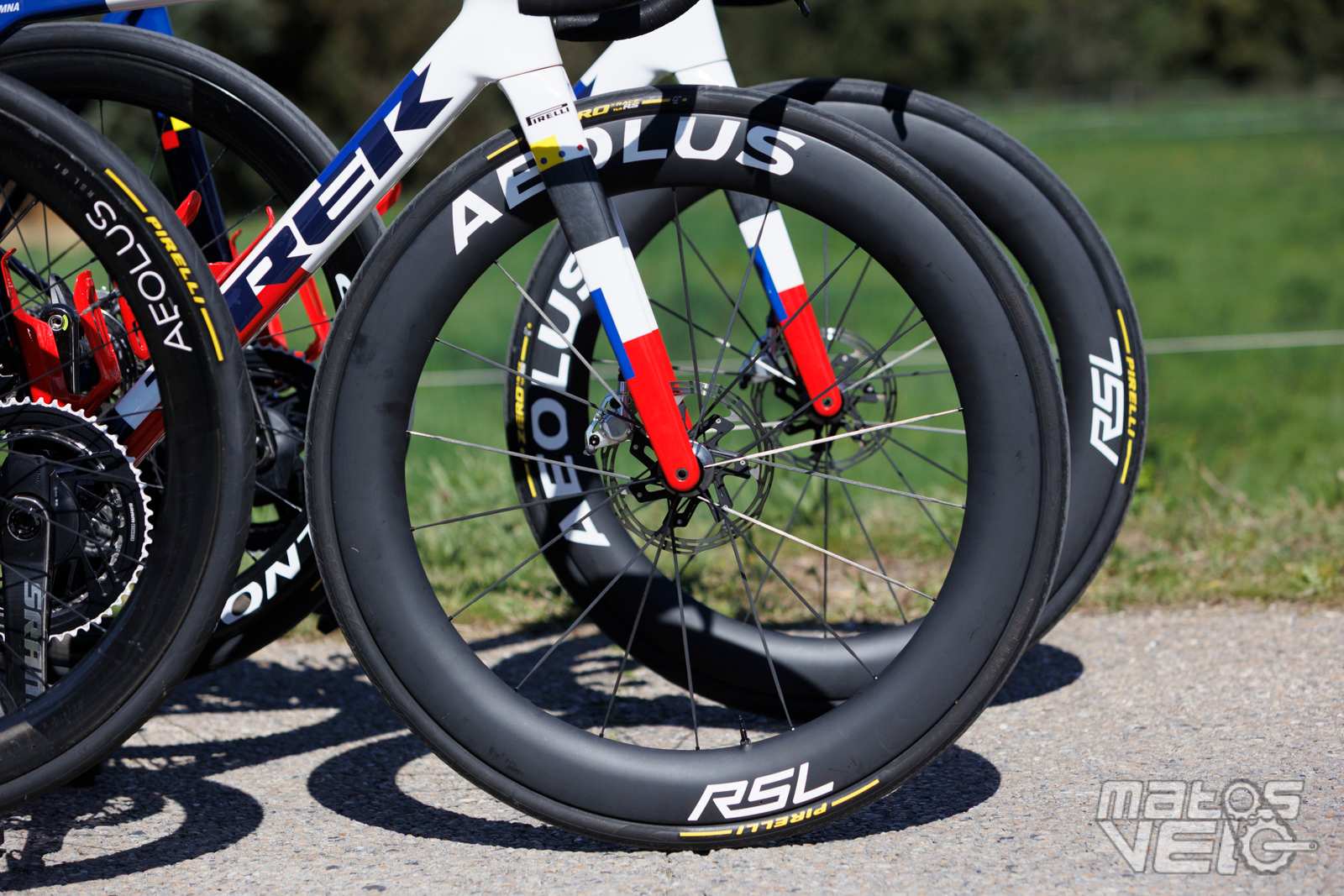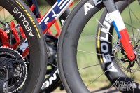 Aperçues sur quelques vélos de l'équipe Lidl-Trek, de nouvelles roues Aeolus. Un profil qui semble situé entre 51 et 65 mm de haut et une jante plus large que l'actuelle.