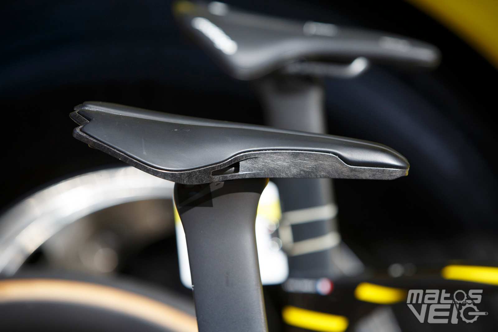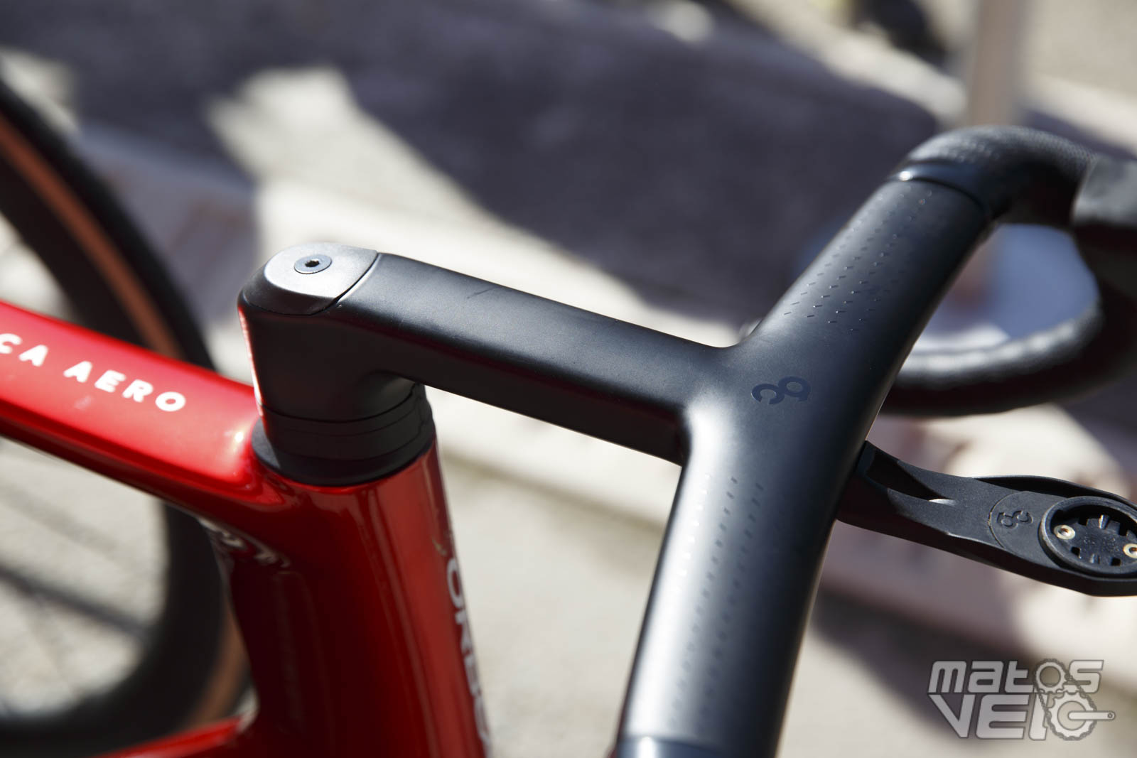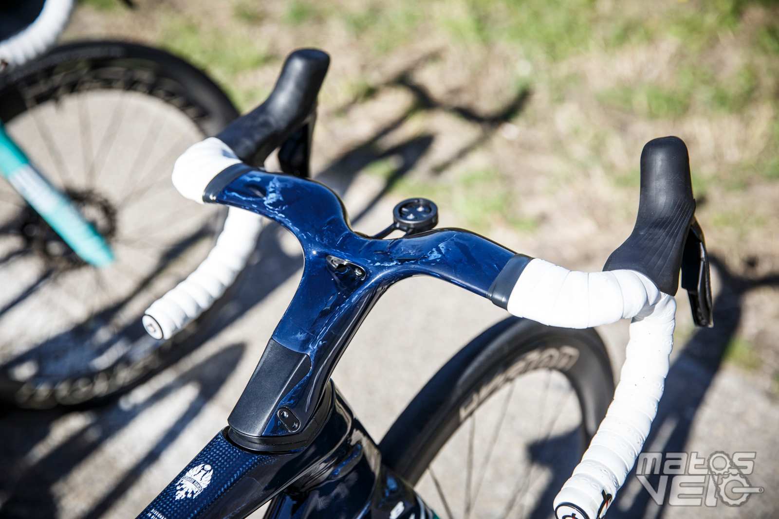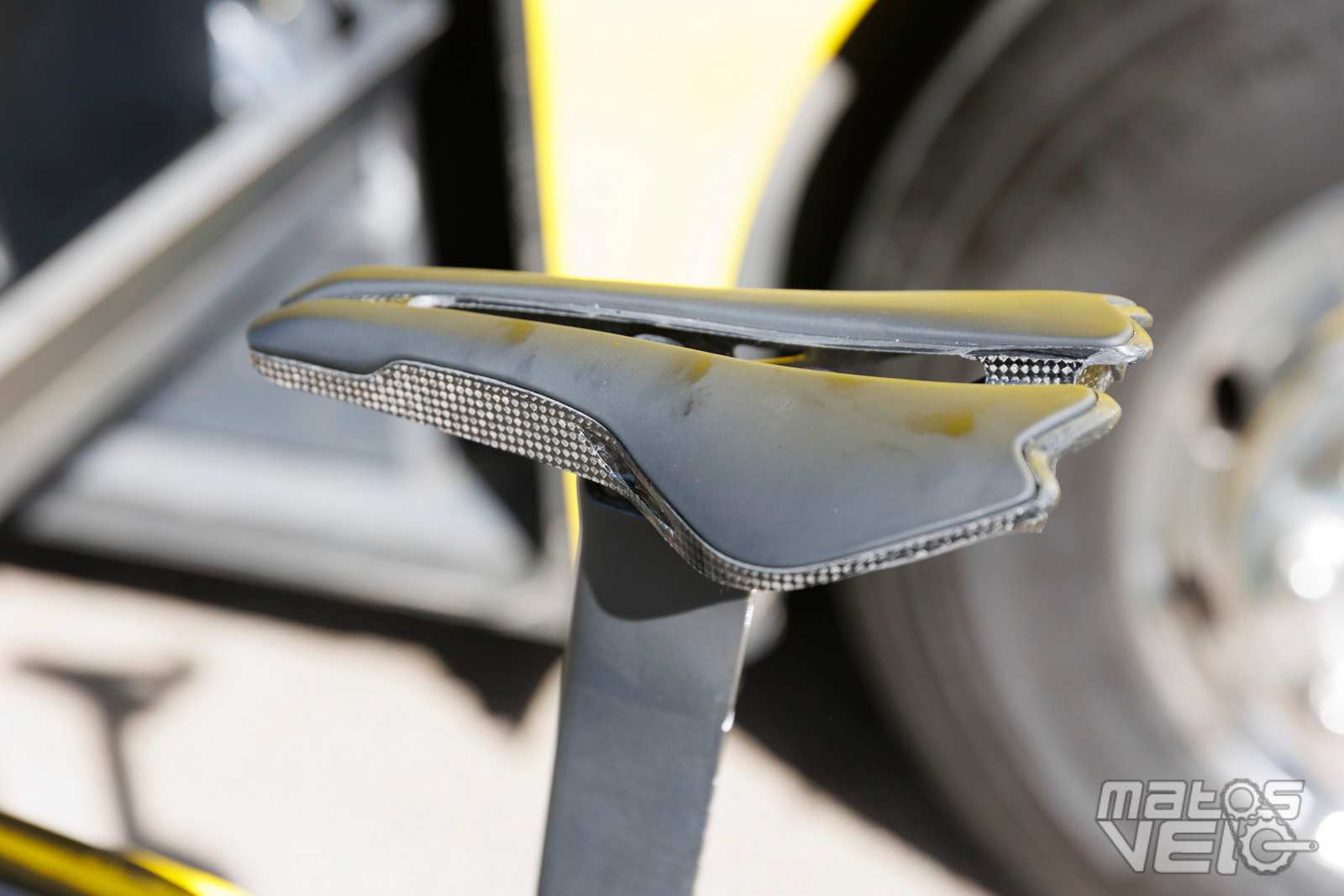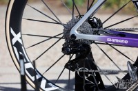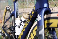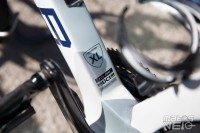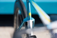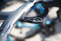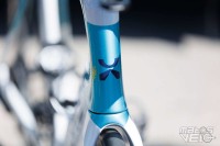 Une jolie pièce de carbone, au reflets bleutés au soleil. Un concept qui reprend ce que Cervélo avait inauguré avec son S5 et qui fut ensuite copié chez Colnago pour le Y1RS.