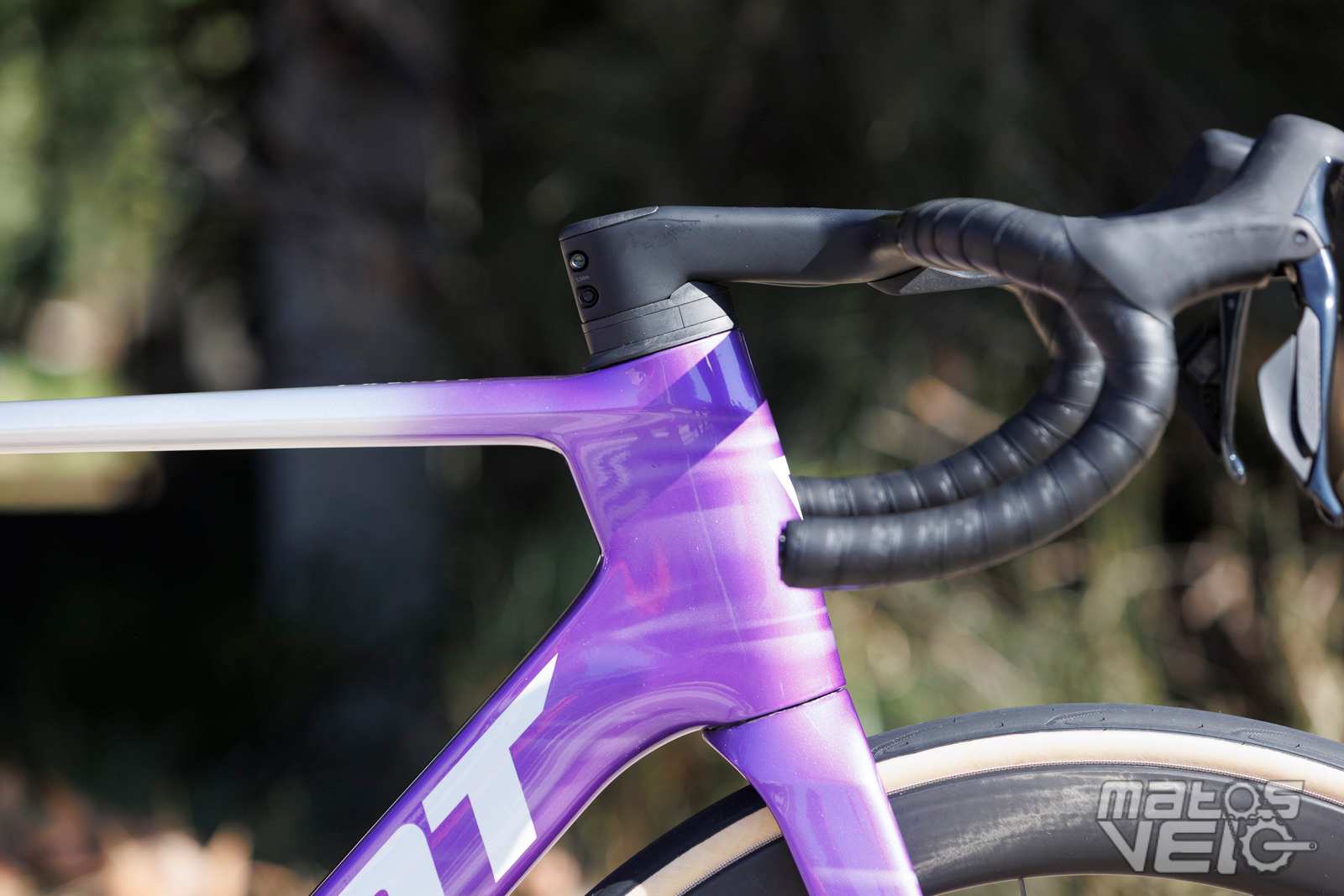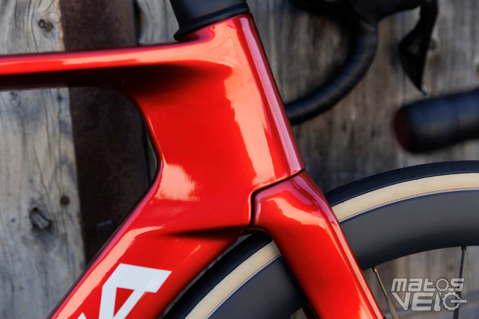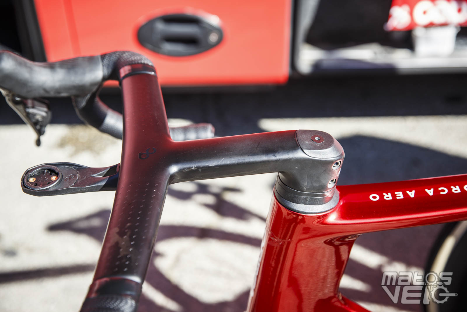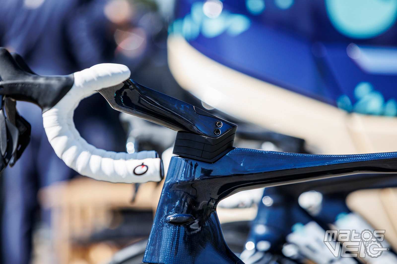 Une jolie pièce de carbone, au reflets bleutés au soleil. Un concept qui reprend ce que Cervélo avait inauguré avec son S5 et qui fut ensuite copié chez Colnago pour le Y1RS.