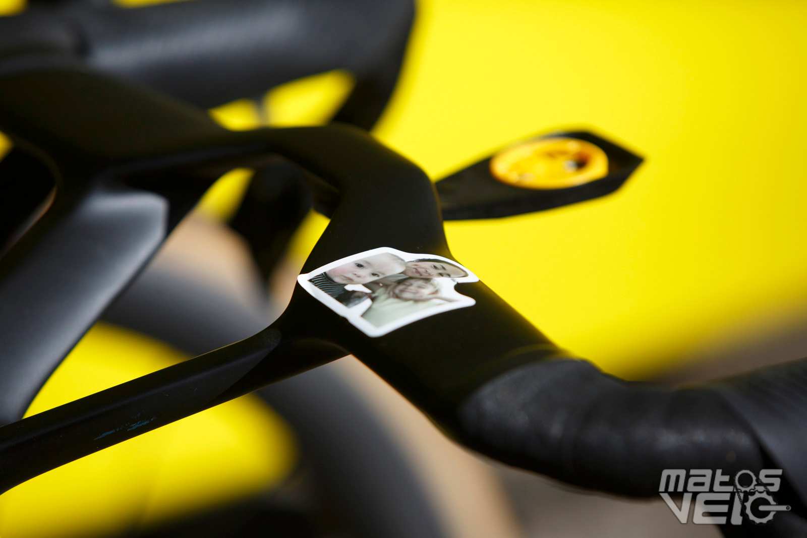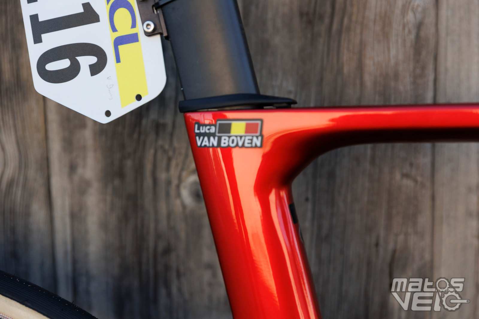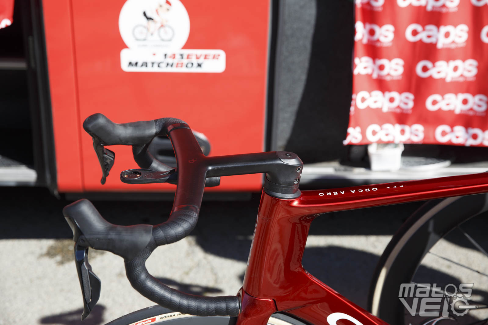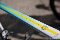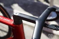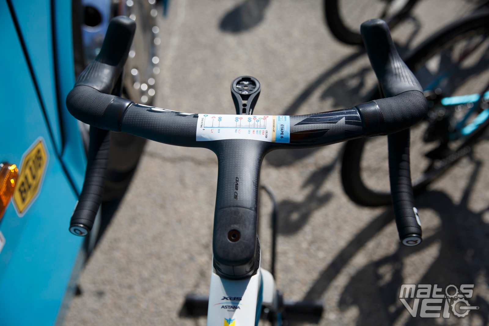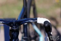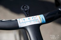 Malgré un très grand cadre de 60 cm, il est obligé de recourir à un cockpit avec une potence de 160 mm. Et pourtant, la sortie de selle n'est pas énorme comme vous pouvez le voir sur les photos, le coureur étant plutôt "court" des jambes malgré sa taille.
