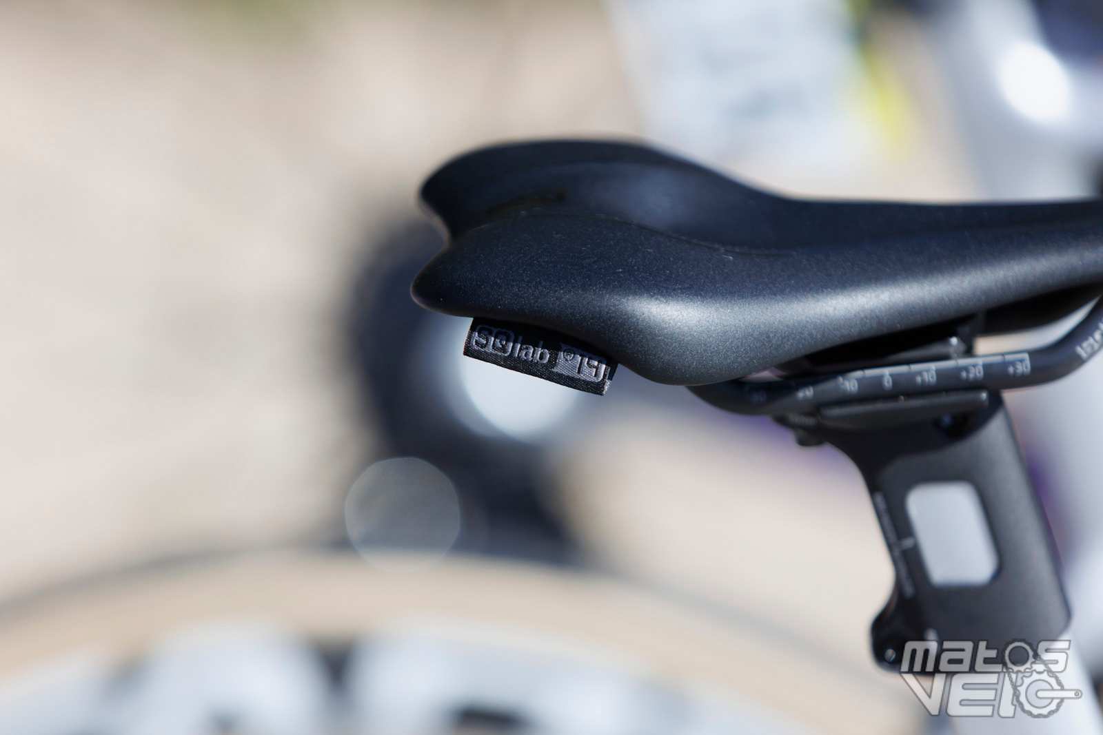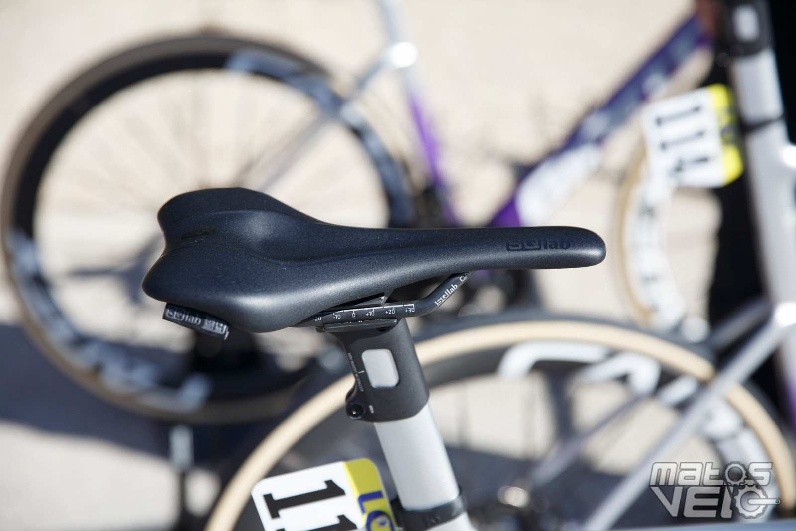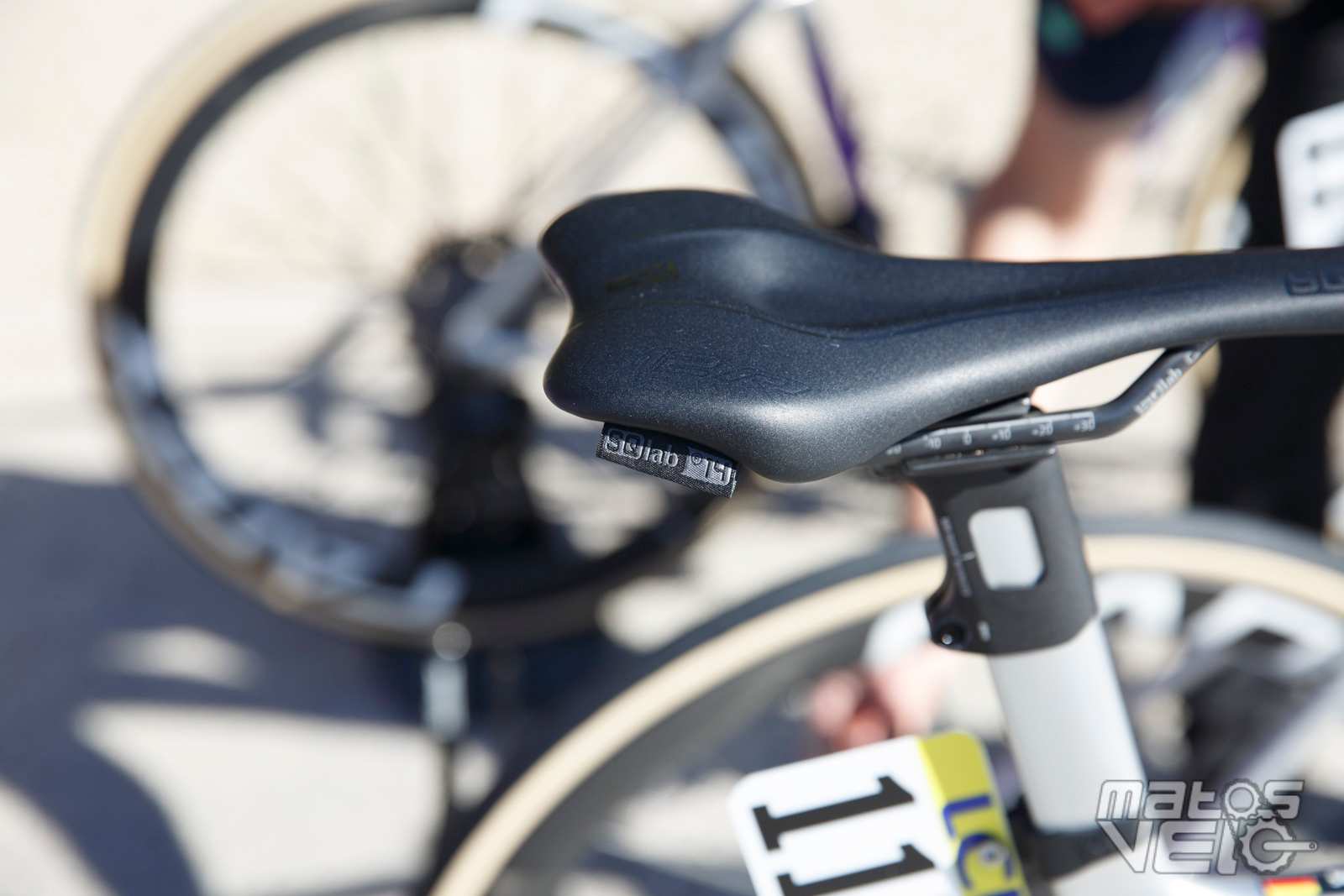 Un coureur utilise une selle SQ Lab. Ici, cela semble être une 612 ERGOWAVE Carbon de 14 cm de large. Une selle à moins de 150 g qui peut être choisie avec une largeur allant de 12 à 15 cm, idéal pour les coureurs très sensibles.