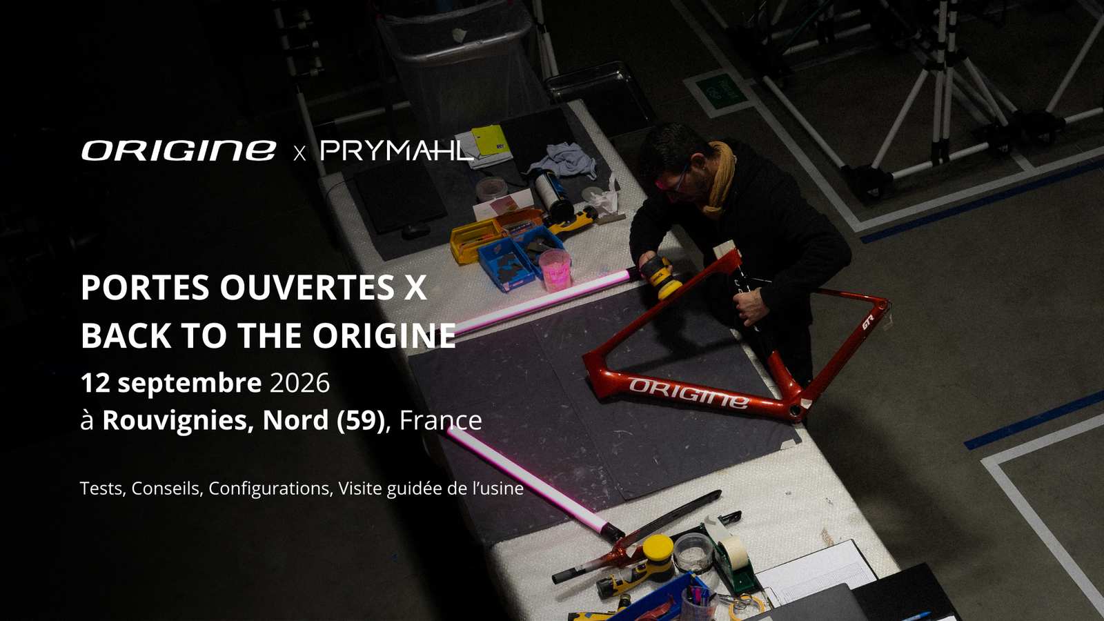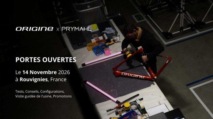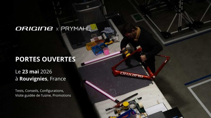 À l’occasion de la 5ᵉ édition du Back to the Origine, Origine vous donne rendez-vous le samedi 12 septembre 2026 pour une journée exceptionnelle. Les portes ouvertes de l’usine Origine, de 10h à 18h, seront l’opportunité de découvrir les coulisses de la marque avec la visite guidée de l’usine, des tests de vélos (Route, Gravel, VTT et VAE), Nos experts seront également à votre disposition pour une prise de côtes et une étude de configuration personnalisée.