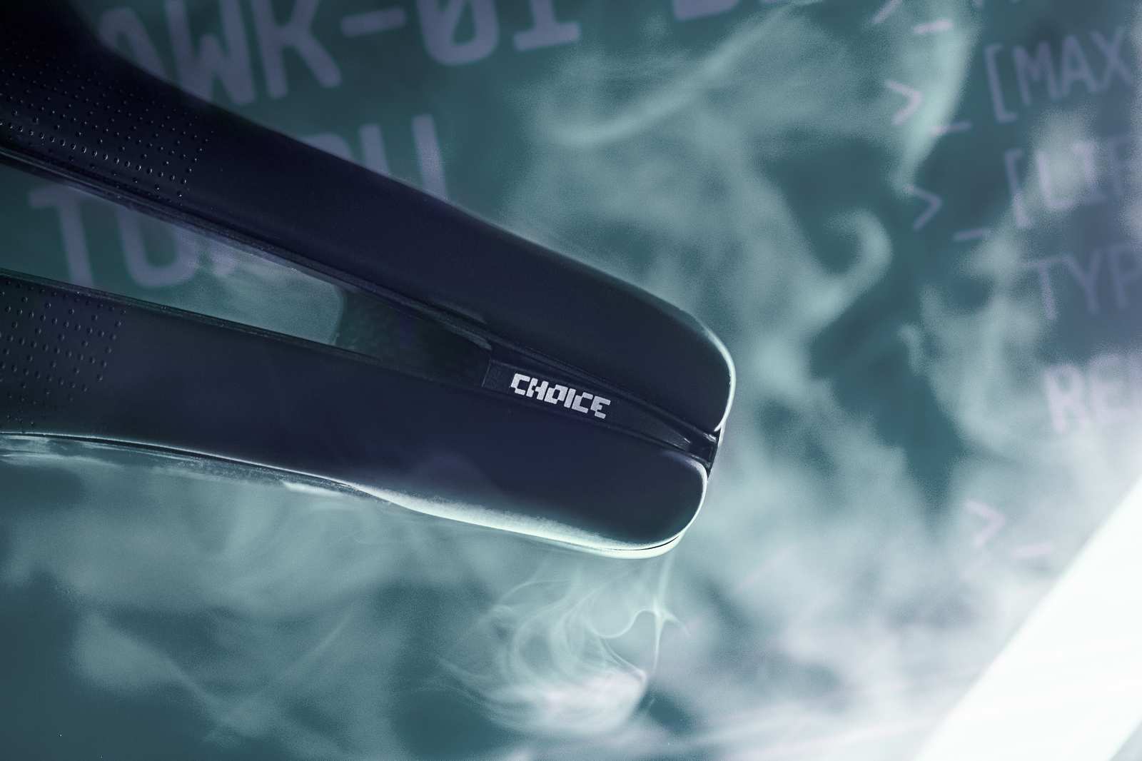 L'une des caractéristiques distinctives de la Choice est sa haute efficacité aérodynamique, étroitement liée au concept d'intégration du rail. Le rail Nack (fibre de carbone nano) est entièrement dissimulé par deux ailerons latéraux sinueux, conçus pour dévier le flux d'air frontal et le canaliser vers l'arrière de la selle. Le résultat est un produit extrêmement léger, aérodynamique et réactif dans toutes les conditions.